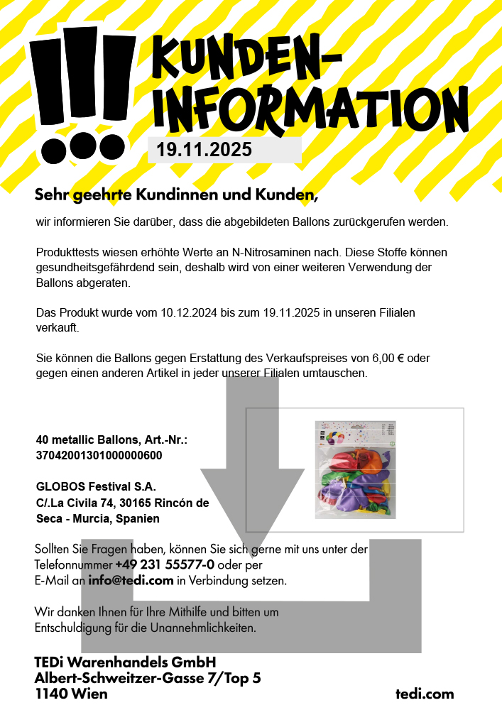 Produkttests wiesen erhöhte Werte an N-Nitrosaminen nach. Diese Stoffe können gesundheitsgefährdend sein, deshalb wird von einer weiteren Verwendung der Ballons abgeraten.
