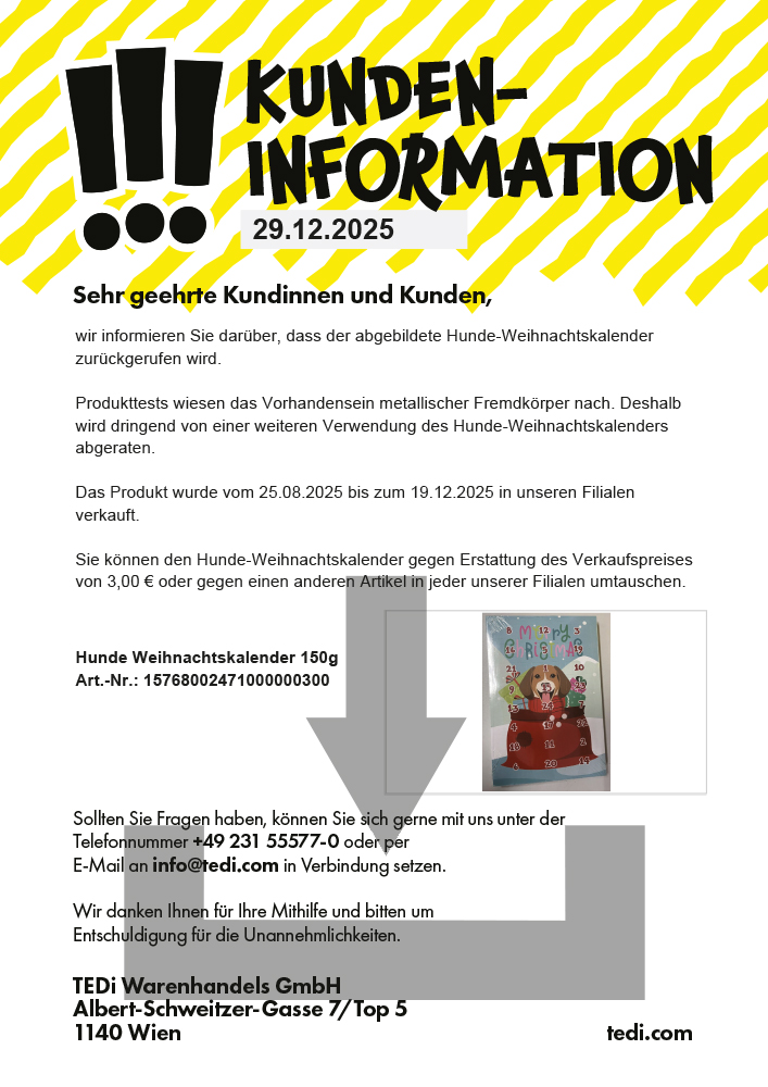 Produkttests wiesen das Vorhandensein metallischer Fremdkörper nach. Deshalb wird dringend von einer weiteren Verwendung des Hunde-Weihnachtskalenders abgeraten.
