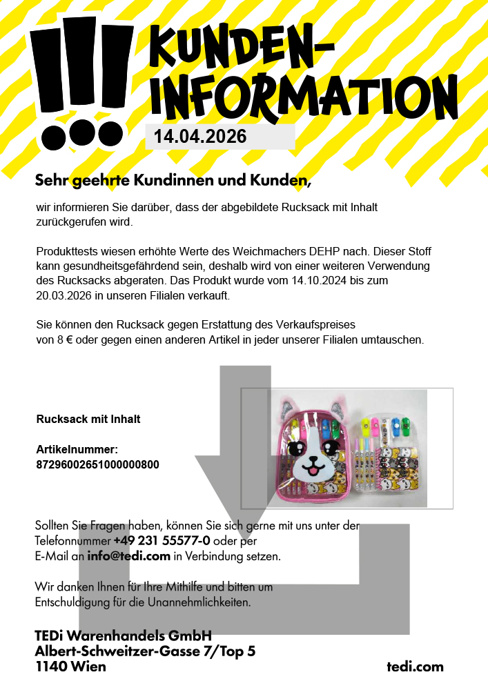 Trotz umfangreicher Prüfungen durch das TEDi-Qualitätsmanagement und externe Prüfinstitute kann es vorkommen, dass Artikel in den Verkauf gelangen, die nicht unseren strengen Qualitätsanforderungen entsprechen. Auch kann der Fall eintreten, dass beworbene Artikel beim Transport beschädigt werden und wir die betroffene Ware kurzfristig aus dem Programm nehmen.
