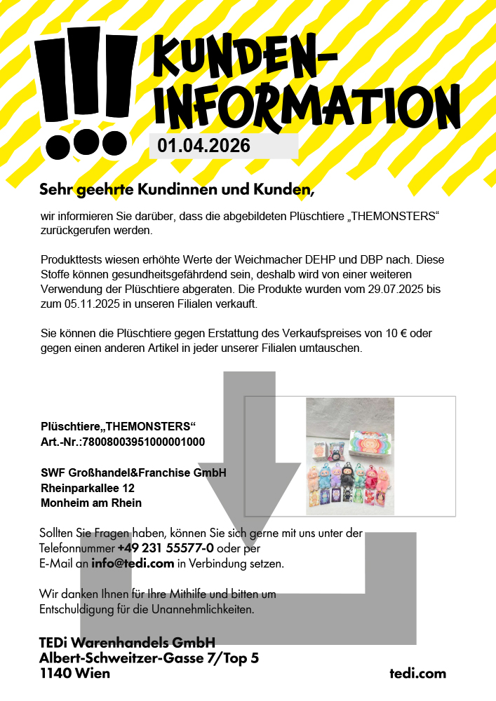 Produkttests wiesen erhöhte Werte der Weichmacher DEHP und DBP nach. Diese Stoffe können gesundheitsgefährdend sein, deshalb wird von einer weiteren Verwendung der Plüschtiere abgeraten.