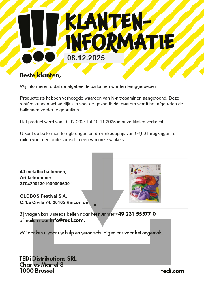 Producttests hebben verhoogde waarden van N-nitrosaminen aangetoond. Deze stoffen kunnen schadelijk zijn voor de gezondheid, daarom wordt het afgeraden de ballonnen verder te gebruiken.