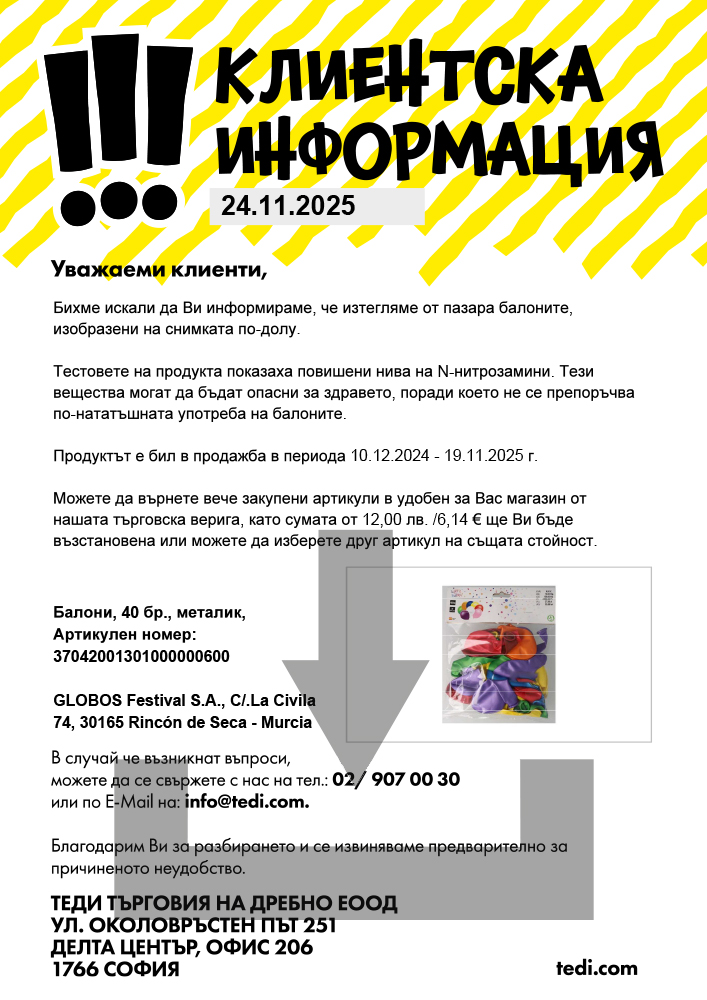 Бихме искали да Ви информираме, че изтегляме от пазара балоните, изобразени на снимката по-долу.