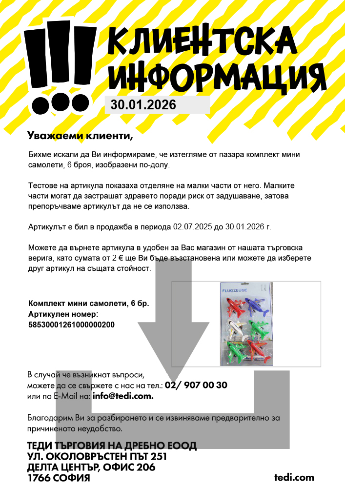 Бихме искали да Ви информираме, че изтегляме от пазара комплект мини самолети, 6 броя, изобразени по-долу.