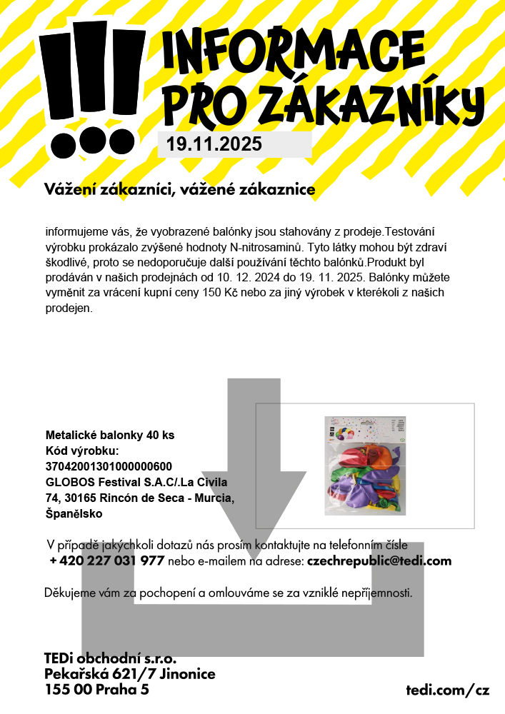 Testování výrobku prokázalo zvýšené hodnoty N-nitrosaminů. Tyto látky mohou být zdraví škodlivé, proto se nedoporučuje další používání těchto balónků.