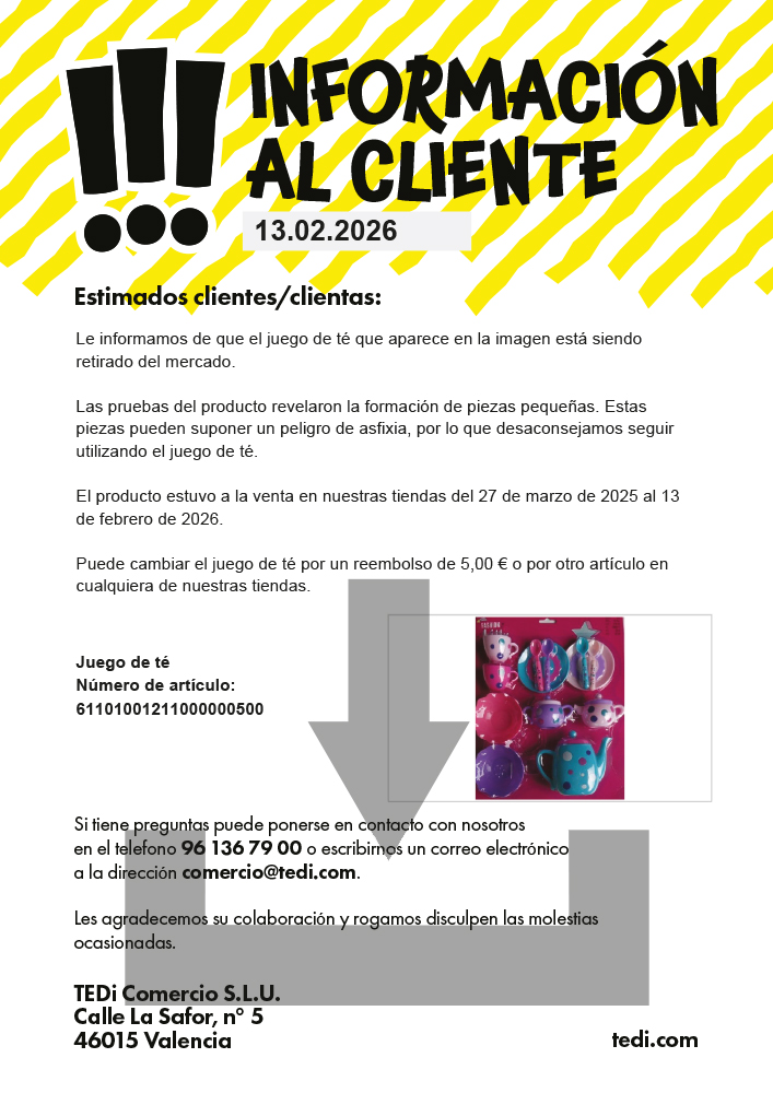 Pese a los extensos controles llevados a cabo por la gestión de calidad de TEDi y por los institutos de control externos, se puede dar el caso de que los artículos en venta no se correspondan con nuestros estrictos requisitos de calidad.