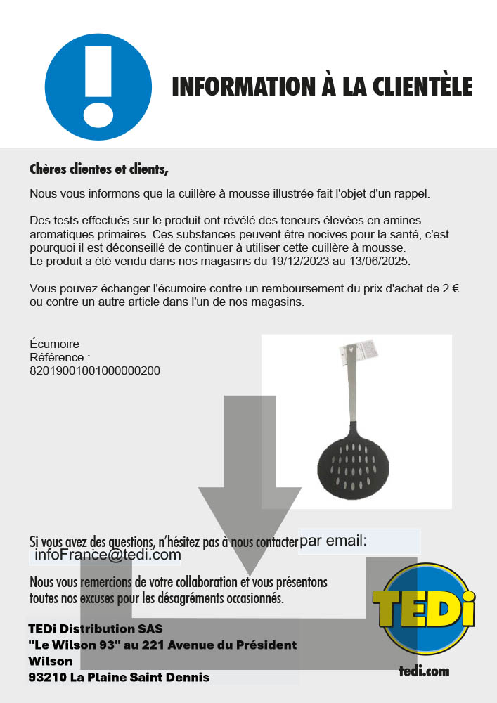 Des tests effectués sur le produit ont révélé des teneurs élevées en amines aromatiques primaires. Ces substances peuvent être nocives pour la santé, c'est pourquoi il est déconseillé de continuer à utiliser cette cuillère à mousse.