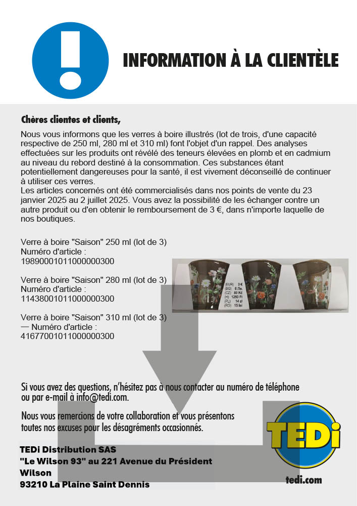 Des analyses effectuées sur les produits ont révélé des teneurs élevées en plomb et en cadmium au niveau du rebord destiné à la consommation. Ces substances étant potentiellement dangereuses pour la santé, il est vivement déconseillé de continuer à utiliser ces verres.