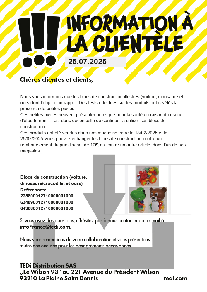 Des tests effectués sur les produits ont révélés la présence de petites pièces. Ces petites pièces peuvent présenter un risque pour la santé en raison du risque d'étouffement. Il est donc déconseillé de continuer à utiliser ces blocs de construction.