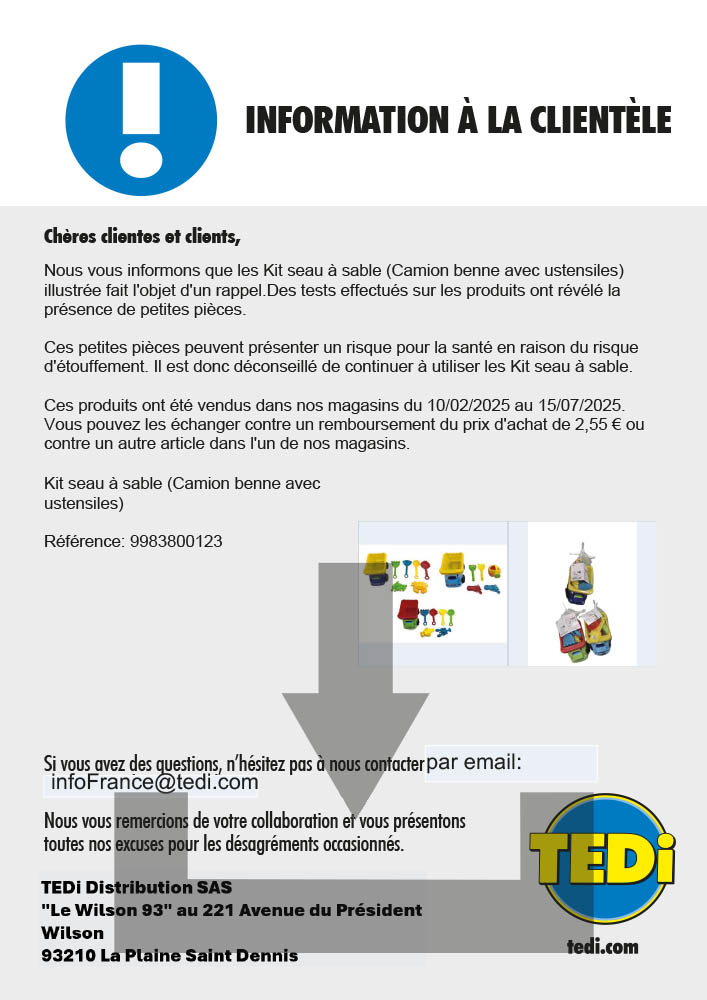 Des tests effectués sur les produits ont révélé la présence de petites pièces. Ces petites pièces peuvent présenter un risque pour la santé en raison du risque d'étouffement. Il est donc déconseillé de continuer à utiliser les Kit seau à sable.