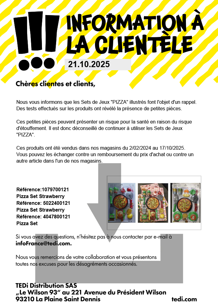 nous vous informons que les Sets de Jeux "PIZZA" illustrés font l'objet d'un rappel. Des tests effectués sur les produits ont révélé la présence de petites pièces.