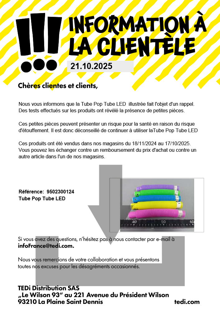 nous vous informons que la Tube Pop Tube LED illustrée fait l'objet d'un rappel. Des tests effectués sur les produits ont révélé la présence de petites pièces.