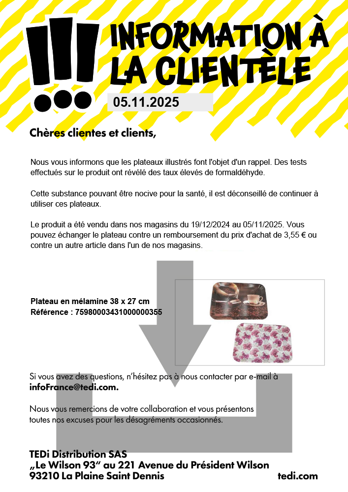 Des tests effectués sur le produit ont révélé des taux élevés de formaldéhyde. Cette substance pouvant être nocive pour la santé, il est déconseillé de continuer à utiliser ces plateaux.