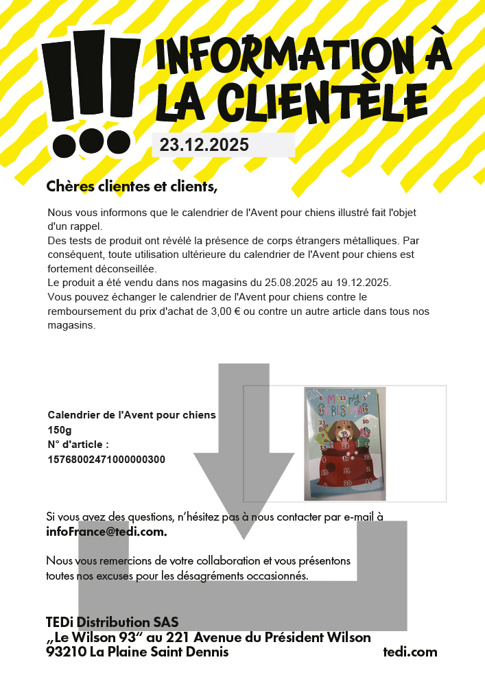 Nous vous informons que le calendrier de l'Avent pour chiens illustré fait l'objet d'un rappel.