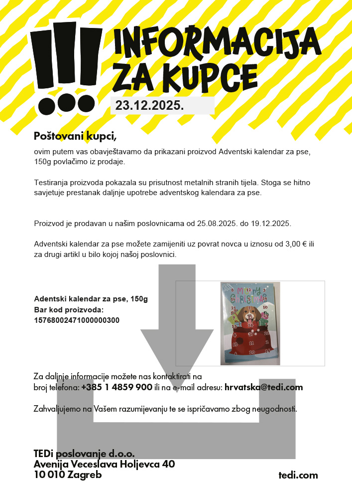 Testiranja proizvoda pokazala su prisutnost metalnih stranih tijela. Stoga se hitno savjetuje prestanak daljnje upotrebe adventskog kalendara za pse.