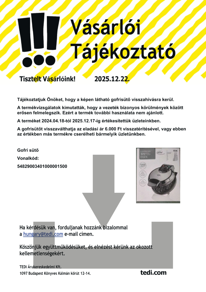 Tájékoztatjuk Önöket, hogy a képen látható gofrisütő visszahívásra kerül.