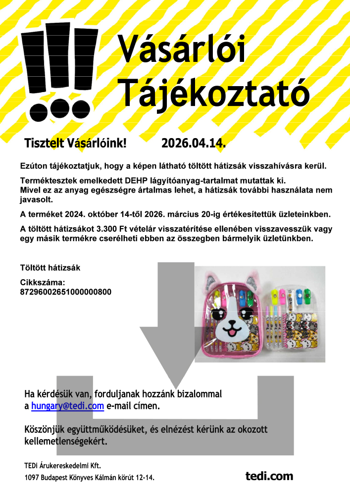 Terméktesztek emelkedett DEHP lágyítóanyag-tartalmat mutattak ki. Mivel ez az anyag egészségre ártalmas lehet, a hátizsák további használata nem javasolt.