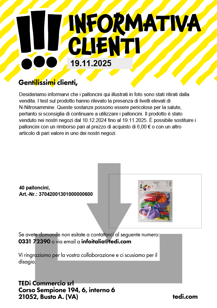 I test sul prodotto hanno rilevato la presenza di livelli elevati di N-Nitrosammine. Queste sostanze possono essere pericolose per la salute, pertanto si sconsiglia di continuare a utilizzare i palloncini.