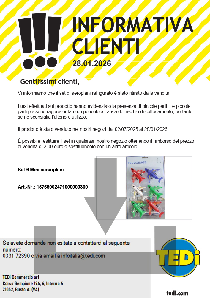 Nonostante le verifiche approfondite condotte dalla Gestione della qualità TEDi e da istituti di prova esterni può accadere che vengano messi in vendita articoli non conformi ai nostri rigorosi standard di qualità. Può inoltre accadere che gli articoli pubblicizzati si danneggino durante il trasporto, costringendoci a toglierli dalla gamma dei prodotti disponibili senza preavviso.