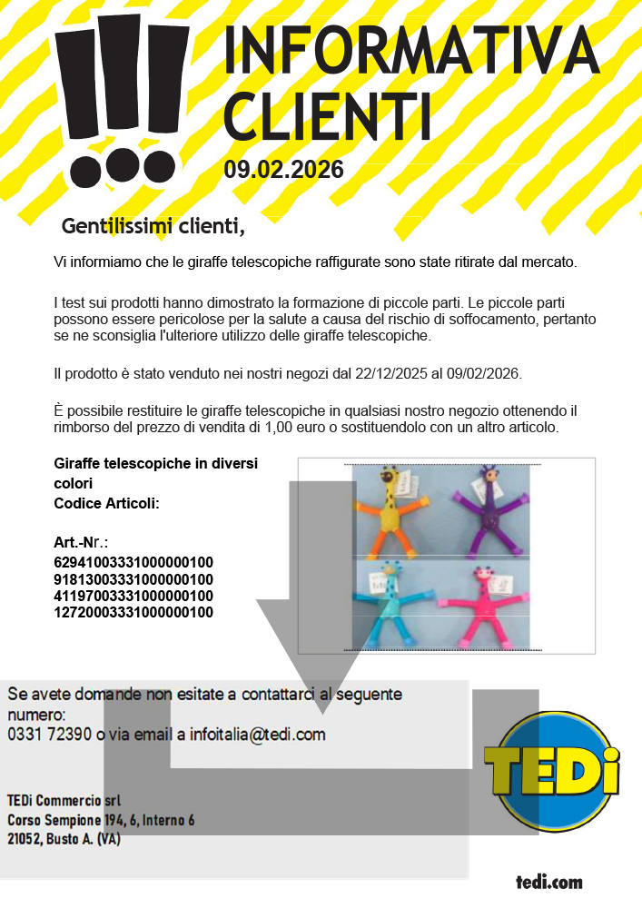 Vi informiamo che le giraffe telescopiche raffigurate sono state ritirate dal mercato.