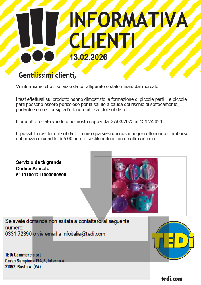 I test effettuati sul prodotto hanno dimostrato la formazione di piccole parti. Le piccole parti possono essere pericolose per la salute a causa del rischio di soffocamento, pertanto se ne sconsiglia l'ulteriore utilizzo del set da tè.