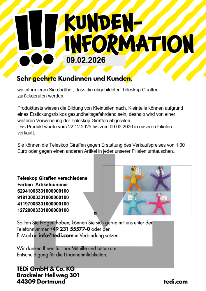 Produkttests wiesen die Bildung von Kleinteilen nach. Kleinteile können aufgrund eines Erstickungsrisikos gesundheitsgefährdend sein, deshalb wird von einer weiteren Verwendung der Teleskop Giraffen abgeraten.