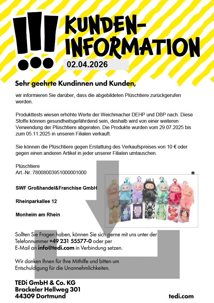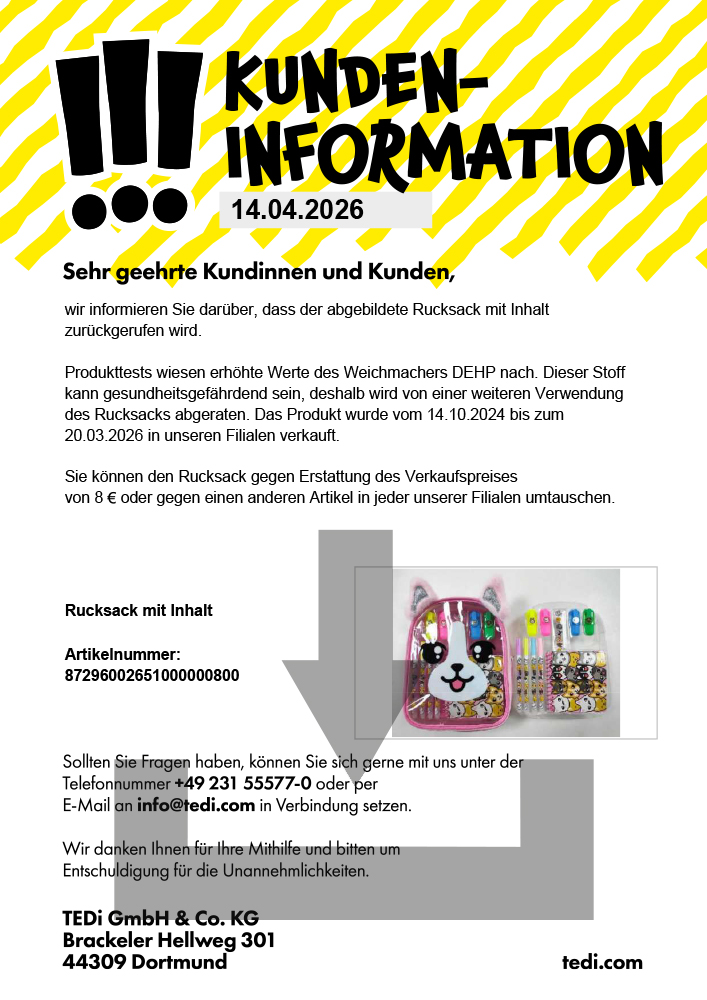 Trotz umfangreicher Prüfungen durch das TEDi-Qualitätsmanagement und externe Prüfinstitute kann es vorkommen, dass Artikel in den Verkauf gelangen, die nicht unseren strengen Qualitätsanforderungen entsprechen. Auch kann der Fall eintreten, dass beworbene Artikel beim Transport beschädigt werden und wir die betroffene Ware kurzfristig aus dem Programm nehmen.