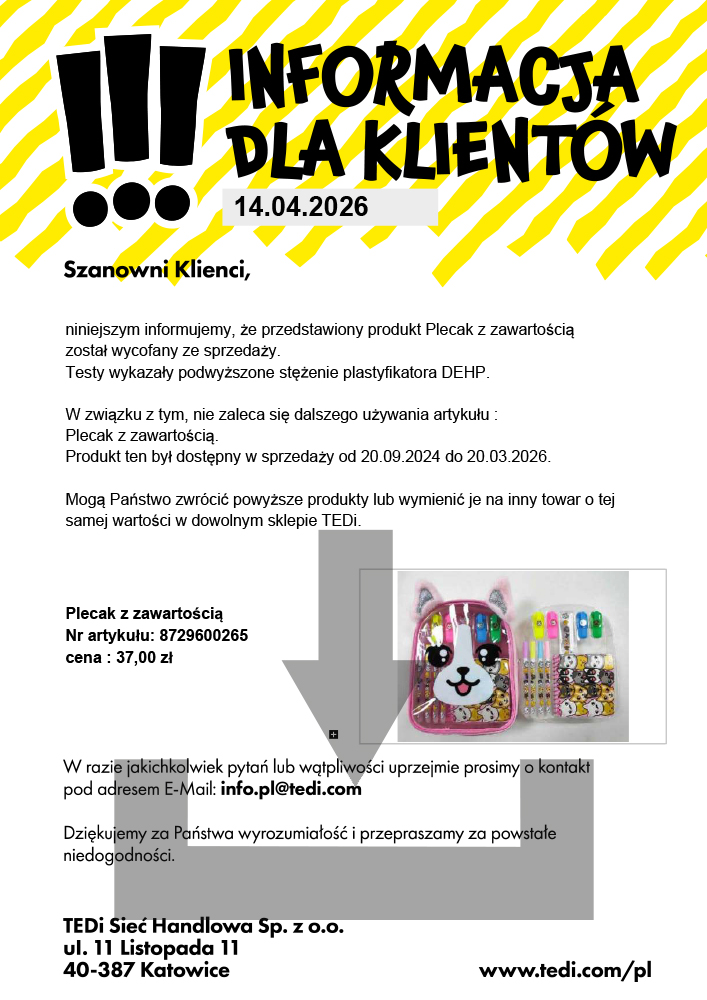 Pomimo szeroko zakrojonych badań nad zarządzaniem jakością przeprowadzonych przez TEDi i zewnętrzne instytuty badawcze, istnieje możliwość, że do sprzedaży trafią produkty niespełniające naszych rygorystycznych wymagań jakościowych. Może się również zdarzyć, że reklamowany towar ulegnie uszkodzeniu w transporcie i produkt zostanie natychmiast usunięty z asortymentu.