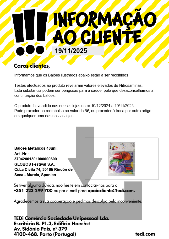 Testes efectuados ao produto revelaram valores elevados de Nitrosaminas. Esta substância podem ser perigosas para a saúde, pelo que desaconselhamos a continuação dos balões.