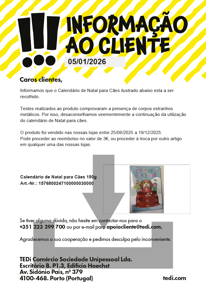 Testes realizados ao produto comprovaram a presença de corpos estranhos metálicos. Por isso, desaconselhamos veementemente a continuação da utilização do calendário de Natal para cães.