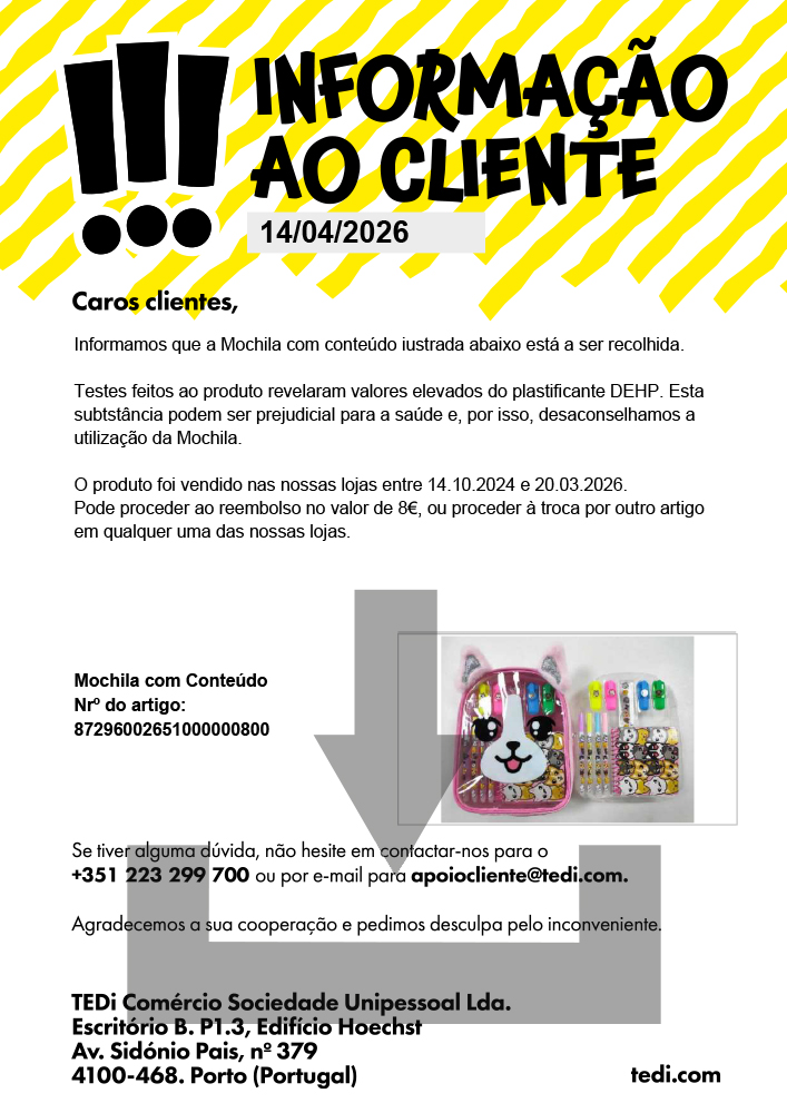 Apesar das verificações extensivas efetuadas pela gestão da qualidade da TEDi e por institutos de ensaio externos, pode acontecer que sejam vendidos artigos que não correspondam aos nossos requisitos de qualidade rigorosos. Também pode acontecer que os artigos anunciados sejam danificados durante o transporte e que retiremos o produto em causa do programa a curto prazo.