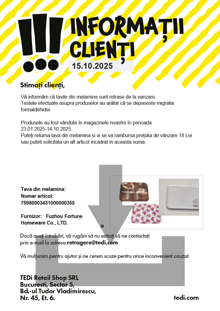 vă informăm că tavile din melamina sunt retrase de la vanzare.