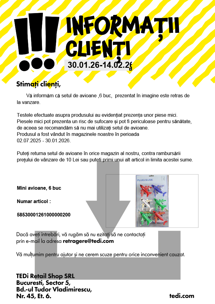 Testele efectuate asupra produsului au evidențiat prezența unor piese mici. Piesele mici pot prezenta un risc de sufocare și pot fi periculoase pentru sănătate, de aceea se recomandăm să nu mai utilizați setul de avioane.