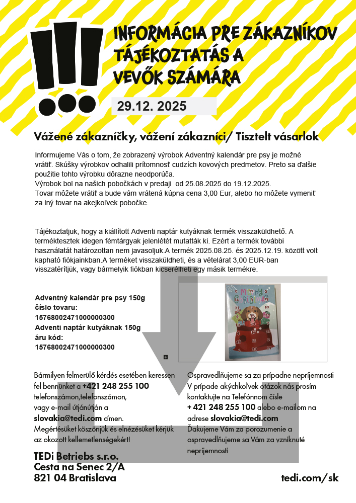 Informujeme Vás o tom, že zobrazený výrobok Adventný kalendár pre psy je možné vrátiť.