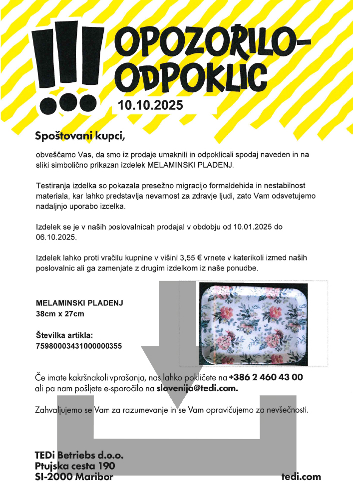 obvescamo Vas, da smo iz prodaje umaknili in odpoklicali spodaj naveden in na sliki simbolicno prikazan izdelek MELAMINSKI PLADENJ.