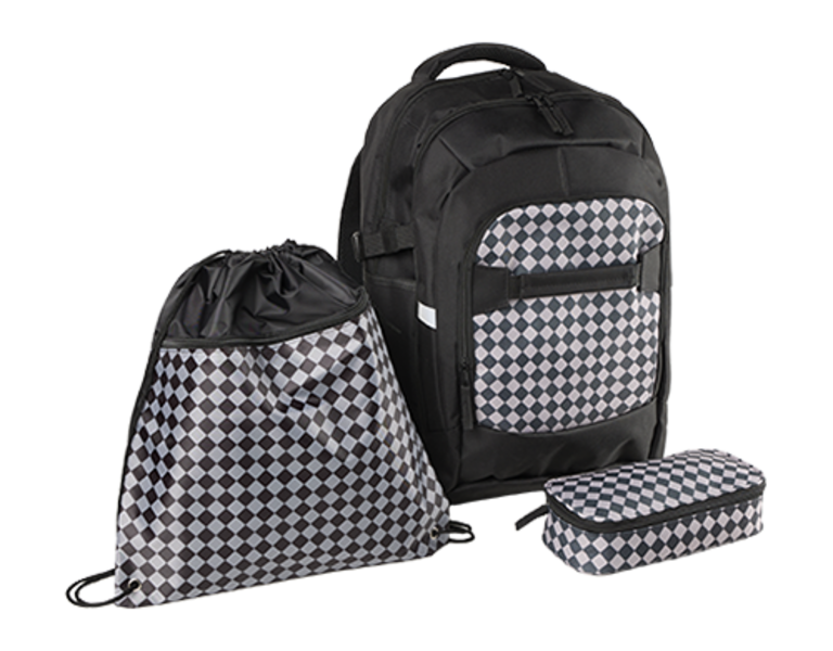 3-teilig, bestehend aus: Schulranzen, Schlamperetui und Sporttasche - verstellbare Schulterträger, stabiler Tragegriff/ Aufhängeschlaufe, Befestigung für Skateboard, reflektierende Elemente, Seitentaschen für Getränkeflasche oder Taschenschirm, Fächer für A4-Formate, Hefte und Mappen für Federmappe oder Brotdose, je